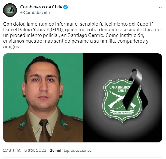 A su vez, la cuenta oficial de Carabineros escribió: “Con dolor, lamentamos informar el sensible fallecimiento del Cabo 1º Daniel Palma Yáñez (QEPD), quien fue cobardemente asesinado durante un procedimiento policial, en Santiago Centro. Como Institución, enviamos nuestro más sentido pésame a su familia, compañeros y amigos”.