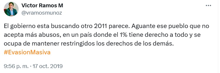 “El gobierno está buscando otro 2011 parece. Aguante ese pueblo que no acepta más abusos, en un país donde el 1% tiene derecho a todo y se ocupa de mantener restringidos los derechos de los demás”, dice el mensaje alojado en la red social, que culminó con un hashtag: “#EvasiónMasiva”.