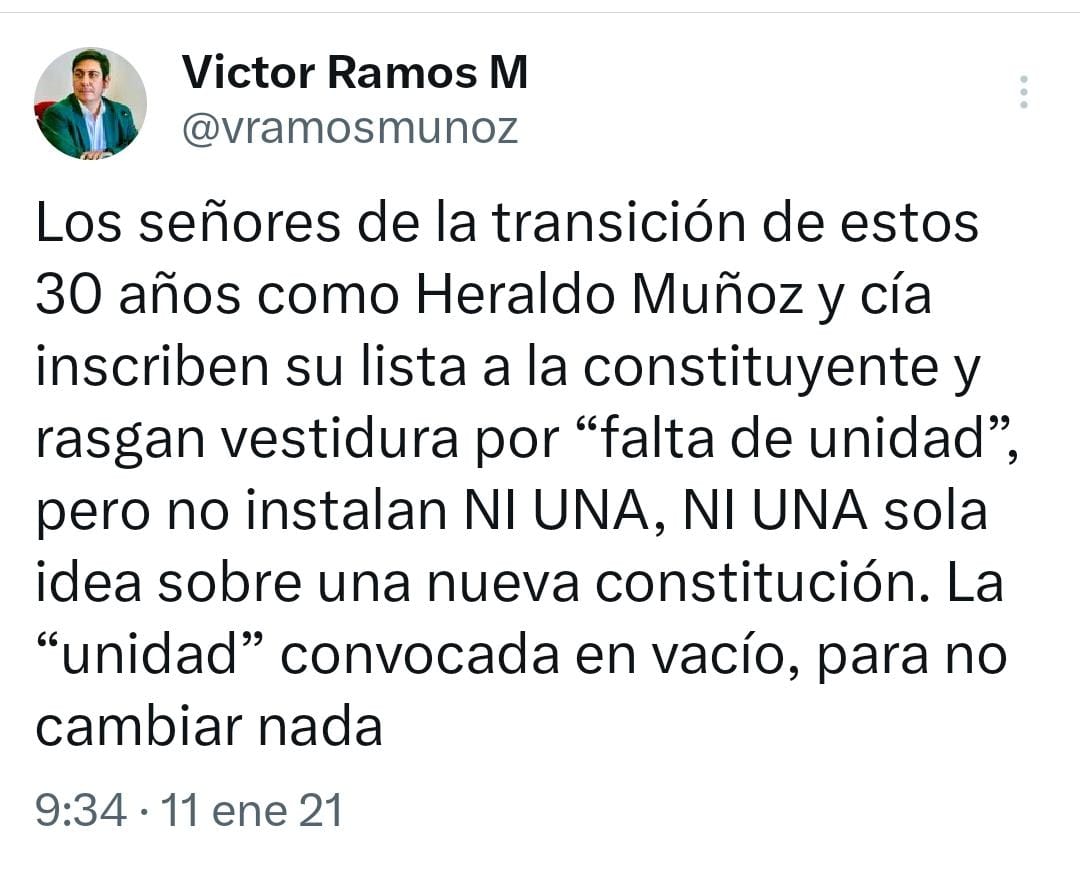 “Los señores de la transición de estos 30 años como Heraldo Muñoz y cía inscriben su lista a la constituyente y rasgan vestidura por “falta de unidad”, pero no instala ni una, ni una sola idea sobre la nueva Constitución. La ‘unidad’ convocada en vacío, para no cambiar nada”, escribió el 11 de enero de 2021.