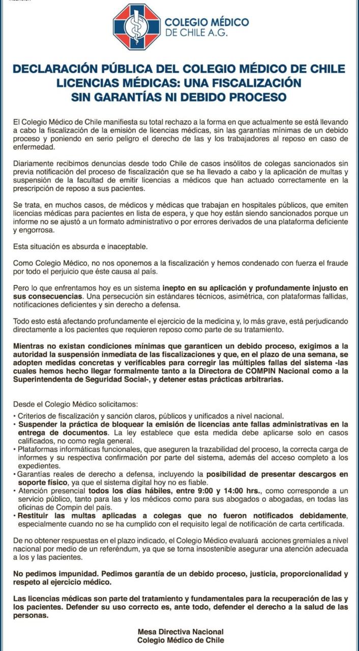 La declaración pública apunta directamente al proceso que lleva a cabo la Comisión de Medicina Preventiva e Invalidez (COMPIN) y la Superintendencia de Seguridad Social (SUCESO). “Desde el Colegio Medico solicitamos suspender la práctica de bloquear la emisión de licencias ante fallas administrativas en la entrega de documentos. La ley establece que esta medida debe aplicarse solo en casos calificados, no como regla general.