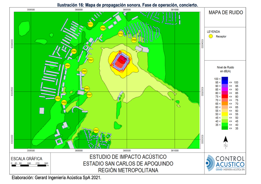 La conclusión del informe presentado por Gerard Ingenería Acústica SpA en 2021 fue que el Claro Arena sí podrá hacer conciertos por los decibeles y que no afectará a zonas residenciales, incluido el horario nocturno (abajo la foto presentada en el informe). Aunque en algunas zonas sí bordea los 50 decibeles (el máximo es 45).