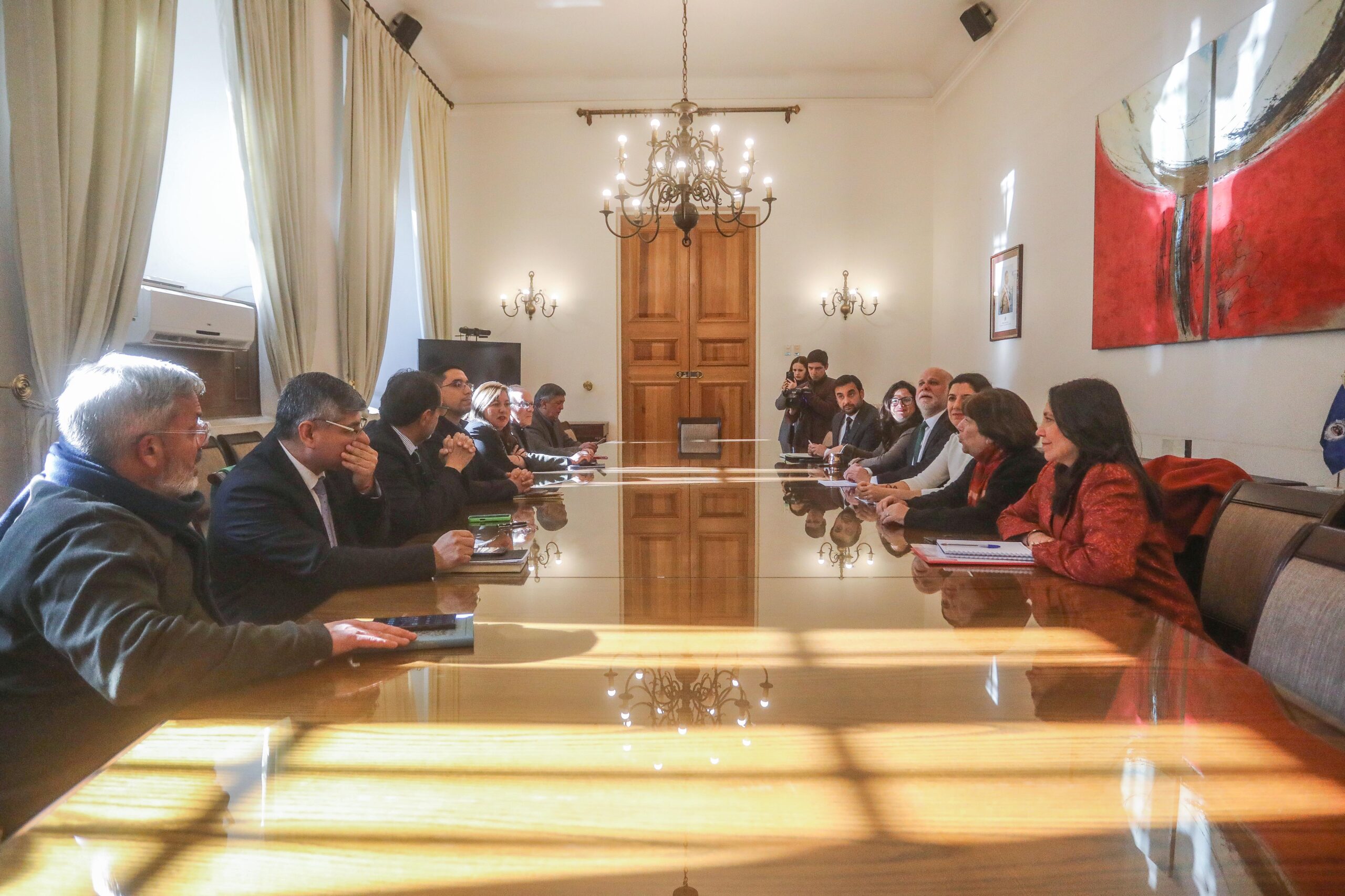 Al otro lado de la mesa, representando al Ejecutivo, estaban el ministro del Interior, Álvaro Elizalde (PS); la ministra vocera subrogante, Aisén Etcheverry (FA); la ministra de Defensa, Adriana Delpiano (PPD); el ministro de Justicia, Jaime Gajardo (PC); la ministra de la Mujer, Antonia Orellana (FA); y la ministra Secretaria General de la Presidencia, Macarena Lobos (independiente). Más tarde se sumó el jefe de gabinete del Presidente Gabriel Boric, Carlos Durán.