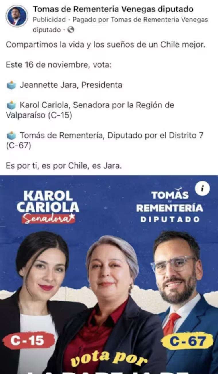 En el afiche en cuestión, aparecían De Rementería, Cariola y Jeannette Jara. El llamado era a votar por los los tres el próximo 16 de noviembre. El primero como diputado (distrito 7), la segunda como senadora y la tercera para la presidencia.