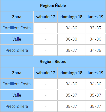 "Lamentablemente la proyección meteorológica para las próximas horas no son buenas", sostuvo el ministro del Interior, Álvaro Elizalde. A su vez la directora de Senapred, Alicia Cebrián, comentó que estas temperaturas "generan condiciones propicias para la propagación de incendios forestales". La Dirección Meteorológica de Chile emitió una alerta por altas temperaturas en varias regiones, entre ellas Ñuble y Biobío, donde las máximas entre domingo y lunes oscilarán entre 37° y 38°.