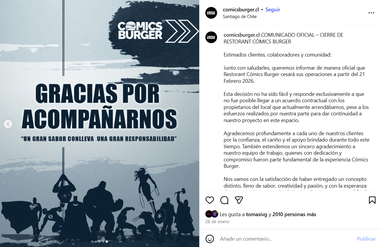 A fines de enero, el restaurant temático Comics Burger anunció la noticia de que, tras cuatro años desplegados en el edificio Dos Caracoles en Providencia, cesaron sus operaciones.