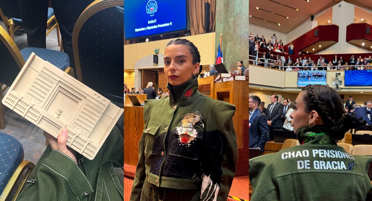 Este miércoles la diputada Javiera Rodríguez (Partido Republicano) llamó la atención por su atuendo en la Cámara de Diputados. “Chao pensiones de gracia”, decía estampado atrás de su chaqueta.
